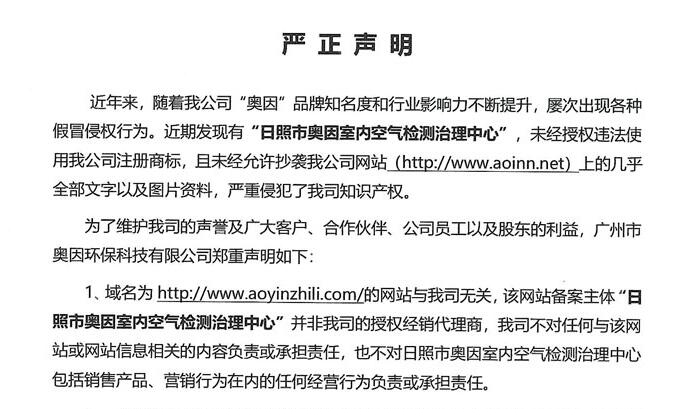 近年來(lái),隨著我公司“奧因”品牌知名度和行業(yè)影響力不斷提升,屢次出現(xiàn)各種假冒侵權(quán)行為。近期發(fā)現(xiàn)有“日照市奧因室內(nèi)空氣檢測(cè)治理中心”,未經(jīng)授權(quán)違法使用我公司注冊(cè)商標(biāo),且未經(jīng)允許抄襲我公司網(wǎng)站的資料。